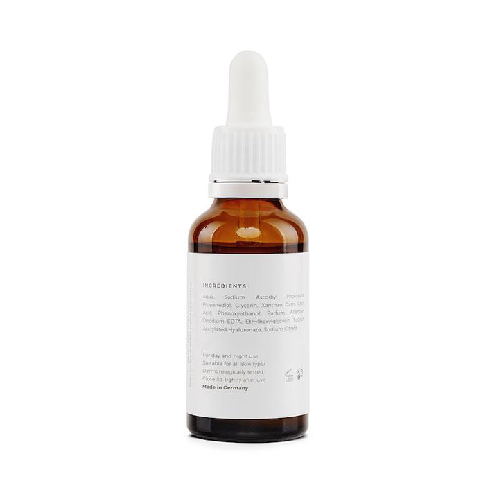Ein leistungsstarkes Vitamin C Serum mit hochdosierter Hyaluronsäure, das aufhellend wirkt und Hautunreinheiten beseitigt.
